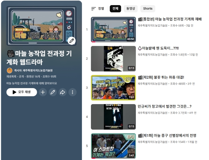 이번에 제작된 콘텐츠는 6분 내외의 에피소드 6편과 40분 분량의 통합본으로 구성됐다. 각 에피소드는 △1화 마늘 종구 선별 △2화 파종 △3화 병해충 방제 △4화 종 제거 △5화 수확 △6화 건조·선별까지 마늘 재배의 전 과정을 단계별로 다루고 있다.