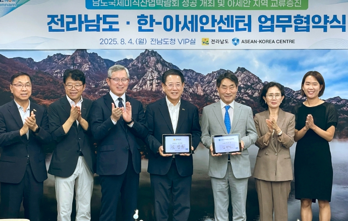 [파이낸셜경제=김예빈 기자] 전라남도는 4일 도청 접견실에서 한-아세안센터와 함께 2025 남도국제미식산업박람회의 성공 개최와 아세안 지역 교류 증진을 위한 업무협약(MOU)을 했다.
