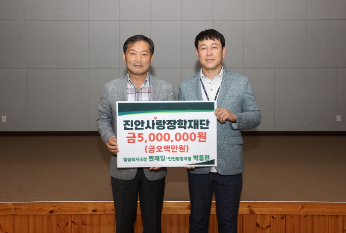 [파이낸셜경제=김예빈 기자] 진안군청 한재길 행정복지국장과 박동현 안전환경국장은 4일 진안사랑장학재단(이사장 전춘성)에 장학금 5백만원을 기탁했다.