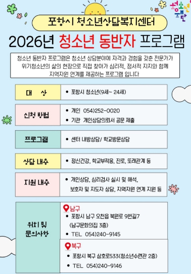 [파이낸셜경제=김지훈 기자] 포항시청소년재단 청소년상담복지센터는 고위기 청소년을 대상으로 생활 현장을 직접 찾아가 지원하는 ‘2026년 청소년동반자 프로그램’을 연중 운영한다.
