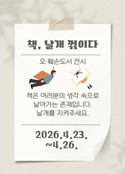 전시의 주제는 ‘책, 날개 꺾이다’로 찢어진 책, 낙서한 책, 밑줄 그은 책 등 독서를 방해하는 행위에 대한 경각심을 일깨우고 책을 이용할 다음 사람을 배려하는 마음가짐을 가지자는 의미를 담고 있다.