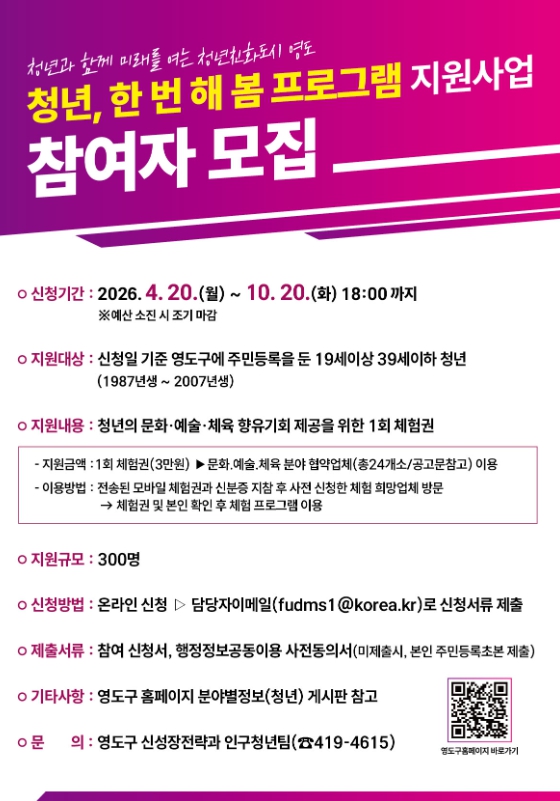 [파이낸셜경제=박영진 기자] 부산 영도구는 청년들에게 문화 향유 기회를 제공하고 지역 청년문화 활성화를 도모하기 위해 '청년, 한 번 해 봄 프로그램 지원사업' 참여자를 이달 20일부터 10월 20일까지 모집한다고 밝혔다.