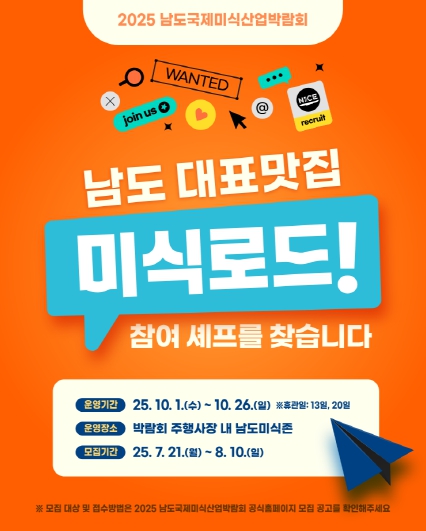 모집 대상은 전라남도에 6개월 이상 거주하거나 사업장을 두고 있는 셰프 또는 맛집 운영자다. 2인 이상의 팀으로 참여할 수 있으며, 하루 500인분 이상의 조리가 가능하고, 미식로드 운영과 조리에 직접 참여해야 한다. 참가팀은 전 기간(10월 1일~26일) 또는 기간별 구간을 선택해 참여할 수 있으며, 전체 기간 참여자가 우선 선정된다.