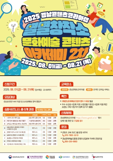 [파이낸셜경제=김예빈 기자] 경남도와 경남문화예술진흥원은 8월 21일까지 ‘2025 경남콘텐츠코리아랩 별별창작소 아카데미 2차(심화과정)’ 교육생을 모집한다고 밝혔다.