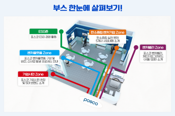 먼저, 크게 5개 영역으로 구분된 부스는 어떻게 구성되었는지 살펴보자. 기업시민 · 벤처플랫폼 · ESG · 탄소중립 · 벤처밸리 총 5개 Zone으로 나누어진 포스코 부스는, 미래산업과 포스코가 추구하는 목표 소개, 그리고 그 길을 뒷받침하는 친환경 사업 및 벤처기업들이 소개되어 있다.