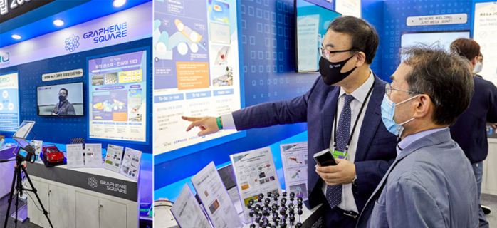‘꿈의 신소재’라 불리는 ‘그래핀(Graphene)’ 생산 전문기업 ‘그래핀스퀘어’는 부스 중앙에 위치해 방문자들을 맞이하고 있었다. ‘그래핀스퀘어’는 세계 최초로 그래핀을 넓은 면적으로 합성해 이를 대량생산할 수 있는 ‘ROLL TO ROLL 연속 합성법’을 개발해 업계를 선도하고 있는 기업이다. 지난 3월 31일에는 포스코, RIST(포항산업과학연구원), 포스텍(포항공과대학교) 포항시와 5자간 ‘포항 그래핀밸리 조성 사업’을 위한 업무협약을 체결하기도 했다.