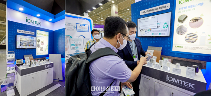 ▲‘이옴텍’에서 부스 방문자에게 친환경 복합소재(SLASTIC)에 관해 소개하고 있다.