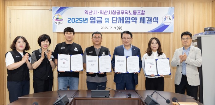 익산시와 익산시공무직노동조합은 9일 '2025년도 임금 및 단체협약'을 체결했다. 이날 협약식은 정헌율 익산시장과 김민철 공무직노조 위원장, 노조 임원 등 10여 명이 참석했다.