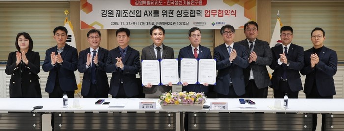 [파이낸셜경제=김예빈 기자] 강원특별자치도는 11월 27일 오후 3시, 강원 제조산업의 AX(AI Transformation, 인공지능 전환)를 위한 상호 협력을 강화하기 위해 한국생산기술연구원(원장 이상목)과 업무협약(MOU)을 체결했다.
