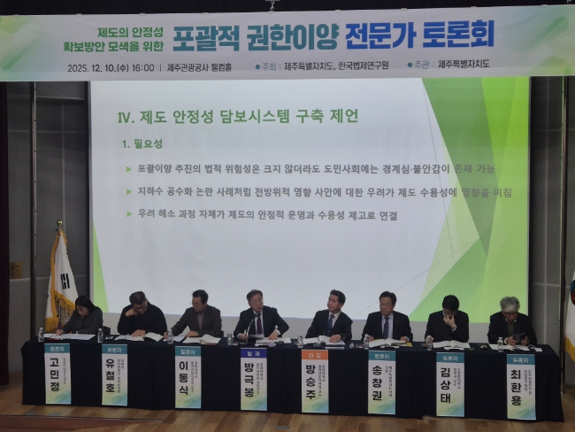 [파이낸셜경제=김영란 기자] 제주특별자치도가 포괄적 권한이양 제도의 실효성과 안정성 확보를 위해 전문가 토론회를 개최한 가운데, 전문가들은 제도의 법적 타당성을 확인하며 공청회 의무화·규제심사 강화 등 안정적 운영 방안을 구체화했다.