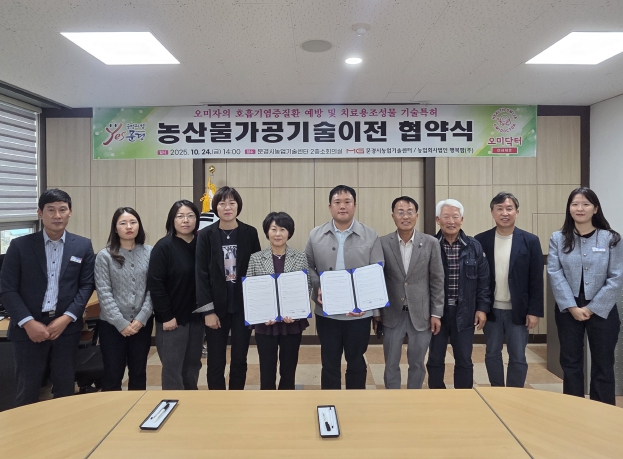 [파이낸셜경제=김지훈 기자] 문경시농업기술센터는 10월 24일 농업기술센터 소회의실에서 “오미자, 배, 도라지추출물을 포함하는 호흡기 염증질환 예방 또는 치료용 조성물”(특허번호 제 : 10-2169920호) 특허기술을 관내업체인 “농업회사법인 행복팜(주)”에 이전하는 기술이전 협약식을 체결했다.