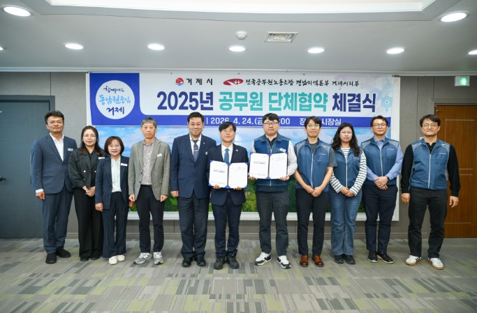 거제시와 전국공무원노동조합 거제시지부는 24일 거제시청 시장실에서 2025년 공무원 단체협약을 체결했다.
