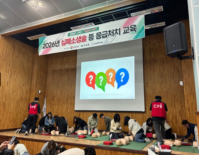 [파이낸셜경제=김예빈 기자] 고성군은 4월 23일부터 24일까지 이틀간 고성군농업기술센터 2층 친환경농업연구소 강당에서 법정의무교육대상자 등 100여 명을 대상으로 ‘2026년 심폐소생술 등 응급처치 교육’을 실시했다.