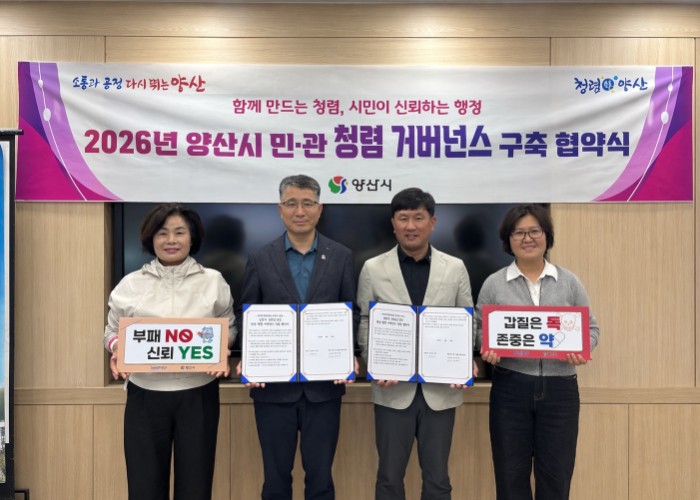 [파이낸셜경제=김예빈 기자] 양산시 안전도시국이 청렴 시책의 실효성을 높이고 민·관 협력체계를 공고히 하기 위해 양산소방서 의용소방대연합회와 ‘민·관 청렴 거버넌스’ 업무협약을 체결했다고 밝혔다.