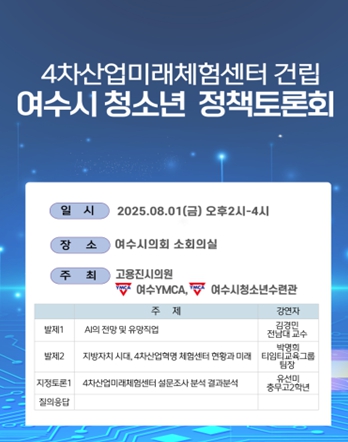 [파이낸셜경제=김예빈 기자] 여수시의회는 8월 1일 여수시의회 소회의실(1층)에서 여수시의회 고용진 의원, 여수YMCA, 여수시청소년수련관과 공동으로 '4차산업미래체험센터 건립을 위한 청소년 정책 토론회'를 개최한다고 밝혔다.
