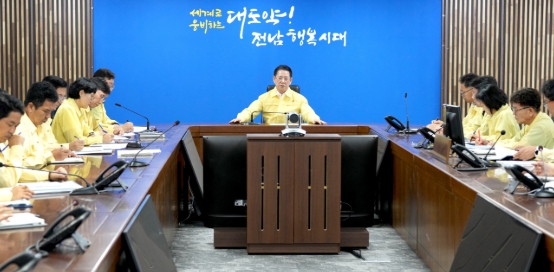 | ▲ 김영록 전라남도지사가 13일 오후 도청 재난종합상황실에서 실국장 등이 참석한 가운데 ‘집중호우 대비 대처상황보고회’를 주재하고 있다. |