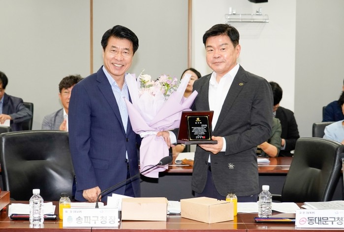 | ▲ 7월 9일 서울시구청장협의회 제198차 정기회의에서 이필형 동대문구청장(사진 오른쪽)이 감사패를 받고 있다. |