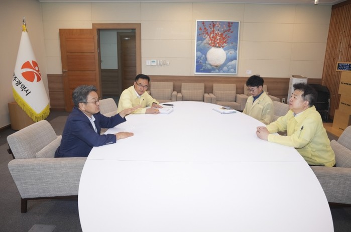 | ▲ 강기정 광주광역시장이 지난 7월29일 시청 접견실에서 김용균 행정안전부 안전정책실장과 이선무 중앙합동조사단 광주반장(행안부 농축산해양재난대응과장)을 만나 광주시 피해지역의 신속한 특별재난지역 지정과 국고 지원 필요성을 강조하고 있다./광주광역시 제공 |