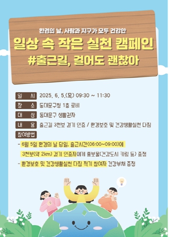이번 캠페인은 6월 5일 오전 9시 30분부터 11시 30분까지 동대문구청 1층 로비에서 동대문구 생활권자를 대상으로 ‘출근길, 걸어도 괜찮아’를 주제로 열린다. 참가자는 출근길에 3000보(약 2km 거리 도보)를 걷고 인증하면 동대문구 대표 캐릭터 ‘디디미’ 열쇠고리를 받을 수 있다. 또한 환경 보호와 건강한 생활 실천에 대한 다짐을 포스트잇에 적어 게시하면 ‘건강부채’도 함께 제공된다.