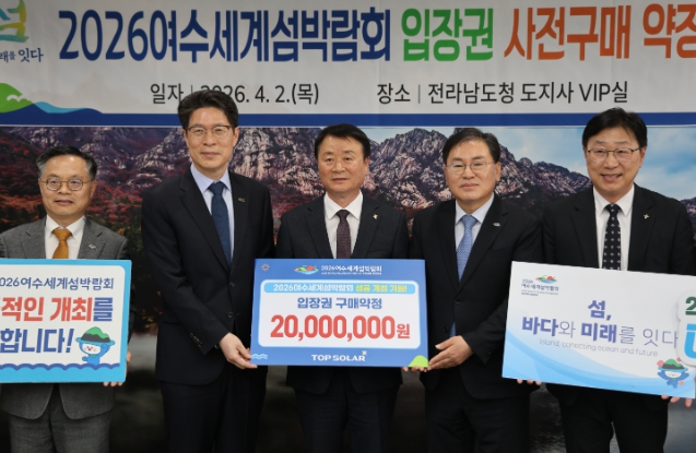 [파이낸셜경제=김예빈 기자] (재)2026여수세계섬박람회조직위원회는 4월 2일 전남도청 VIP실에서 탑솔라㈜와 ‘2026여수세계섬박람회 입장권 구매약정식’을 개최했다고 밝혔다.