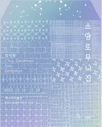 [파이낸셜경제=조성환 기자] 강원문화재단(대표이사 신현상)은 '2025 강원다운작품개발지원' 2년차 지원사업에 선정된 최덕화 작가의 개인전 '소양로 무늬집'이 오는 16일부터 28일까지 춘천 개나리미술관에서 개최된다고 밝혔다.