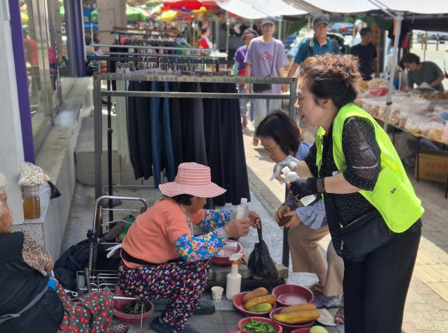 | ▲ 2025년 7월 11일, 달성군 화원시장 장날. 달성군자원봉사센터 관계자가 무더위 속 노점상에게 생수를 건네며 안부를 살피고 있다. |
