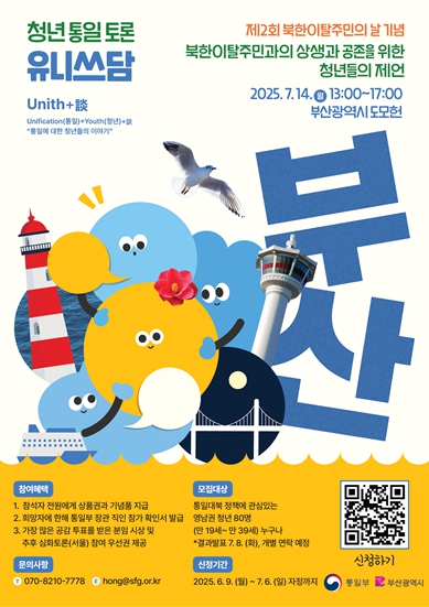 토론회에는 사전 참가 신청을 통해 선정된 영남권 청년 80명과 부산에 거주하는 북한이탈주민이 분임 토론 등에 참여할 예정이다.