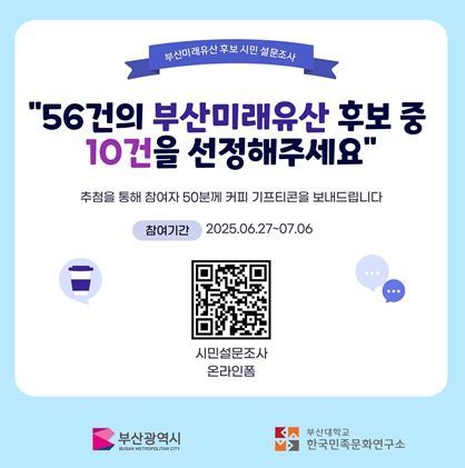 이번 설문조사는 부산시민 누구나 참여할 수 있으며, '2025년 부산미래유산 후보' 목록 56건 중 10건(5개 분야별 2건)을 추천할 수 있다.
