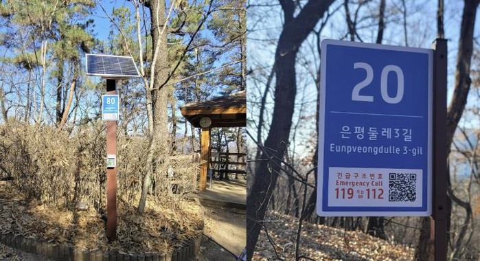 은평둘레길 3~4길 일부 구간 약 5km에 총 43개의 스마트 기초번호판이 설치됐다. 기초번호판에는 위급 상황 발생 시 자신의 현재 위치를 정확히 확인할 수 있도록 QR코드를 탑재했다.