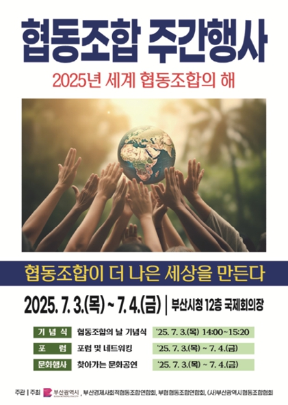 [파이낸셜경제=박영진 기자] 부산시는 '2025년 협동조합의 날(7.5.)'을 맞아 오늘(3일)부터 내일(4일)까지 시청 국제회의장 등에서 협동조합의 가치를 알리기 위한 '협동조합의 날 주간행사'를 개최한다고 밝혔다.