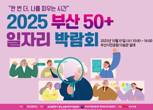 [파이낸셜경제=박영진 기자] 부산시는 내일(10월 1일) 오전 10시부터 오후 4시까지 부산시민공원 다솜관 일대에서 신중년 세대의 인생 2막 도전을 지원하는 '2025년 부산 50플러스(+)일자리 박람회'를 개최한다고 밝혔다.