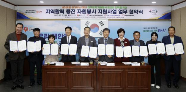 태안군은 지난 27일 군청 소회의실에서 가세로 군수를 비롯해 태안군자원봉사센터 이원희 센터장, 한국중앙자원봉사센터 김의욱 센터장, 충청남도자원봉사센터 오선희 센터장, 태안군주민자치협의회 김관래 회장 포함 6개 읍면 자치회장 등 30여 명이 참석한 가운데 ‘지역활력 증진 자원봉사 지원 사업 협력을 위한 업무협약식’을 개최했다고 밝혔다.