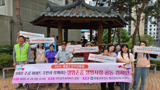 [파이낸셜경제=김기보 기자] 충북 영동군정신건강복지센터는 25일 오후 가마실 주공아파트 광장에서 2025 생명존중안심마을 가마실 주공아파트 입주민과 함께 생명사랑 생명존중 공동 캠페인을 실시했다.
