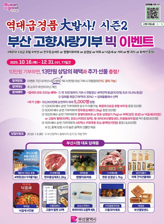 [파이낸셜경제=박영진 기자] 부산시는 오늘(16일)부터 12월 31일까지 77일간, 고향사랑기부제 참여 확산을 위해 '역대급 경품 대발사 시즌2! 부산 고향사랑기부제 연말 빅 이벤트'를 개최한다고 밝혔다.