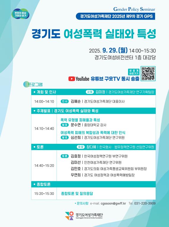 토론자로는 김민호 경기도의회 여성가족평생교육위원회 부위원장, 김효정 한국여성정책연구원 부연구위원, 김미선 인천여성가족재단 연구위원, 우연희 경기도 여성정책과 여성폭력예방팀장이 참여해 토론한다. 좌장은 장다혜 한국형사법무정책연구원 선임연구위원이 맡았다.