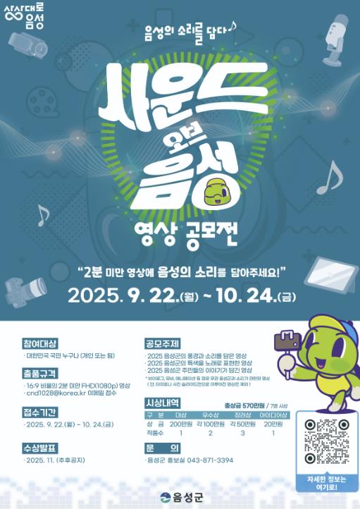 [파이낸셜경제=김기보 기자] 음성군은 오는 10월 24일까지 2025 사운드 오브 음성 영상 공모전을 개최한다고 밝혔다.