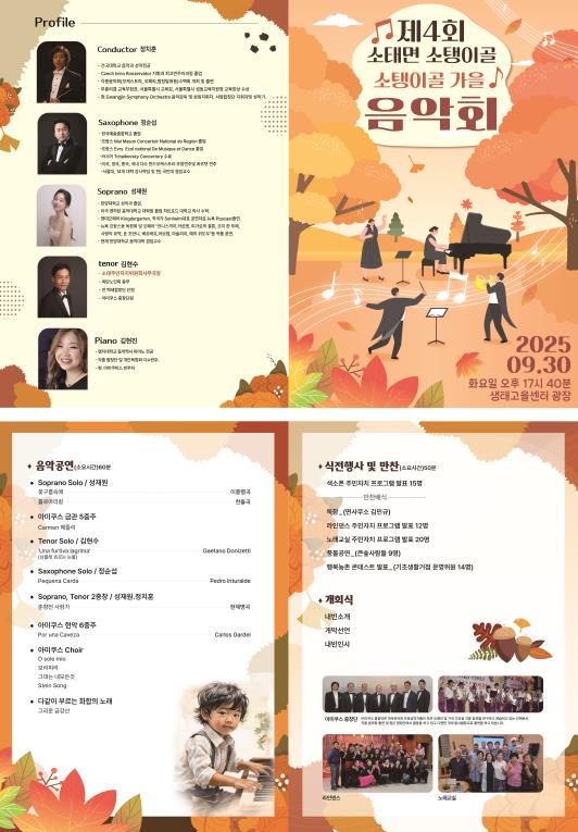 김민 소태면 주민자치위원장은 “소태의 가을 밤하늘 정취와 어우러진 이번 음악회에 많은 분들이 오셔서 아름다운 노래와 연주를 즐기시길 바란다”고 전했다.