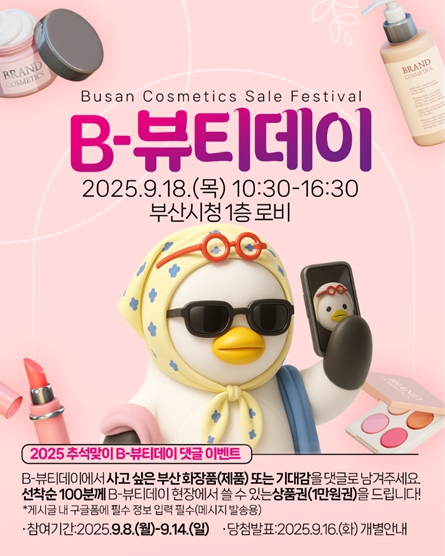 [파이낸셜경제=박영진 기자] 부산시는 오는 9월 18일 오전 10시 30분부터 오후 4시 30분까지 시청 1층 로비에서 '2025 추석맞이 비(B)-뷰티 데이'를 개최한다고 밝혔다.