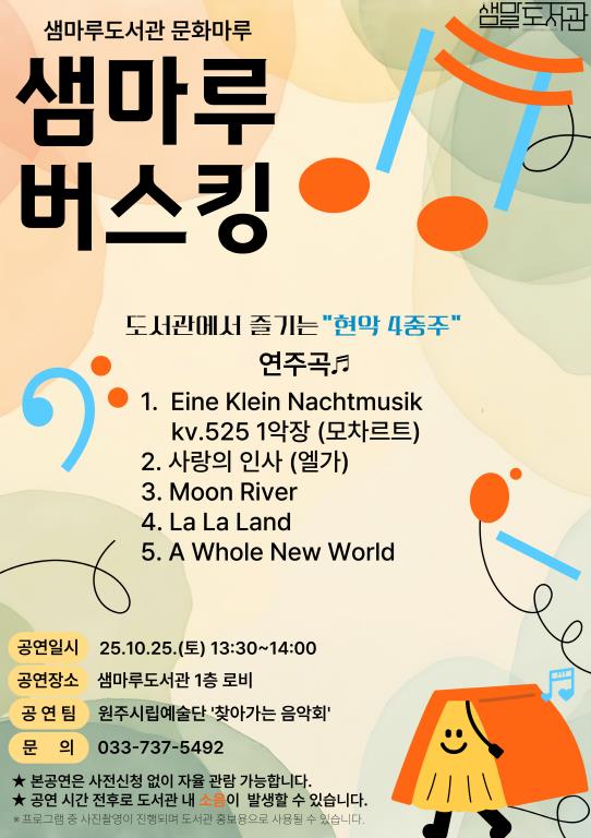 이번 공연은 도서관과 책 사이의 관련성을 강조하는 전통적인 개념에서 벗어나 시민들에게 다양한 문화 체험의 기회를 제공하기 위해 기획됐으며, 원주시립예술단의 ‘찾아가는 음악회’ 프로그램과 협조해 진행된다.