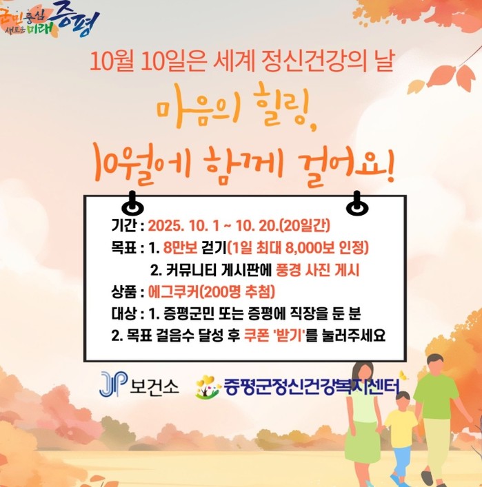 [파이낸셜경제=김기보 기자] 증평군정신건강복지센터가 오는 10월 1일부터 20일까지 ‘마음의 힐링, 10월에 함께 걸어요!’를 주제로 워크온 챌린지를 운영한다.