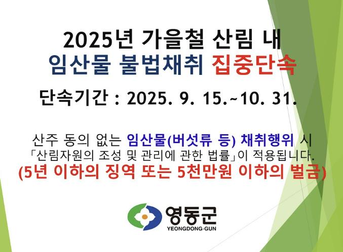 [파이낸셜경제=김기보 기자] 충북 영동군은 본격적인 가을철 임산물 채취 성수기를 맞아 오는 15일부터 산림 내 불법 행위에 대한 집중 단속을 실시한다고 12일 밝혔다.