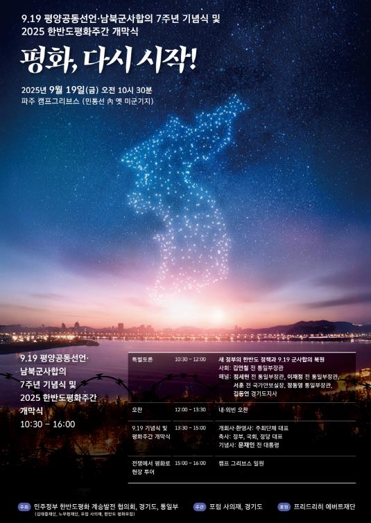 [파이낸셜경제=김영란 기자] 경기도와 통일부, 민주정부 한반도평화 계승발전협의회가 공동으로 주최하고 프리드리히 애버트 재단이 후원하는 ‘9.19 평양공동선언 7주년 기념행사’가 오는 19일 오전 10시 30분 파주 캠프그리브스에서 열린다.