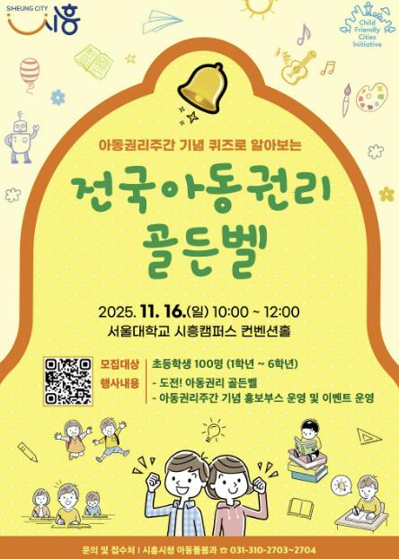 [파이낸셜경제=김기보 기자] 시흥시는 오는 11월 16일 오전 10시, 서울대학교 시흥캠퍼스 컨벤션홀에서 열리는 ‘퀴즈로 알아보는 전국 아동권리 골든벨’에 참가할 초등학생을 10월 31일까지 모집한다.