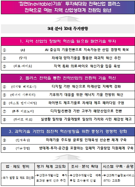 먼저, ‘지역 산업의 창발적 혁신을 일으킬 필연기술 투자’를 위해 ▲인공지능(AI) 중심의 기술 전환으로 지속가능한 산업 경쟁력 확보 ▲차세대 양자 기술을 활용한 파괴적 혁신 추진 ▲지역 특화 의료․바이오 혁신기술 집중 육성 등 3가지 투자방향을 설정했다.