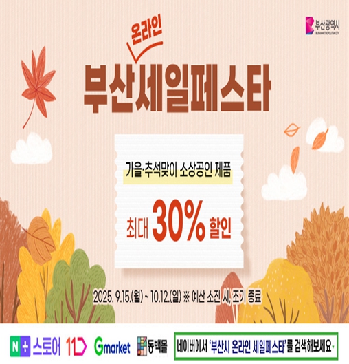 [파이낸셜경제=박영진 기자] 부산시는 15일부터 10월 12일까지 약 한 달간 민족 대명절 추석을 맞아 '가을 추석맞이 부산세일페스타(온라인) 특별 할인전'을 진행한다고 밝혔다.