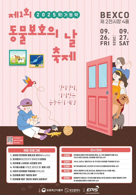 [파이낸셜경제=박영진 기자] 부산시는 농림축산식품부와 공동으로 오는 9월 26일부터 27일까지 이틀간 벡스코 제2전시장에서 '제1회 동물보호의 날 축제'를 개최한다고 밝혔다.