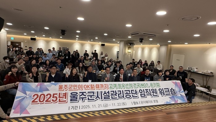 [파이낸셜경제=김예빈 기자] 울주군시설관리공단(이사장 최인식)은 11월 21일 및 22일 양일간 울산 울주군 서생면 소재 온더웨이브에서, 이순걸 울주군수와 최길영 울주군의회 의장이 참석한 가운데,“전국 NO1.공기업, 그 가치를 위한 시작”이란 슬로건으로, 임직원 120여명이 모여 2025년 임직원 워크숍(이하 “워크숍”이라 함)을 개최했다.