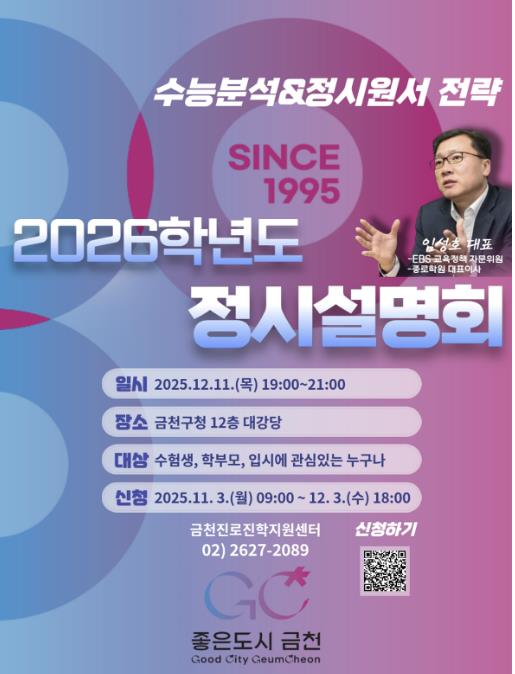 임 대표이사는 ▲2026학년도 수능 실채점 분석 ▲정시모집 반영 방법별 유불리 분석 ▲2025학년도 입시 결과 활용 전략 ▲2026학년도 주요 입시 트렌드 ▲대학·계열별 정시모집 지원 전략 ▲금천구 학생 맞춤형 지원전략 등을 집중적으로 다룰 예정이다.