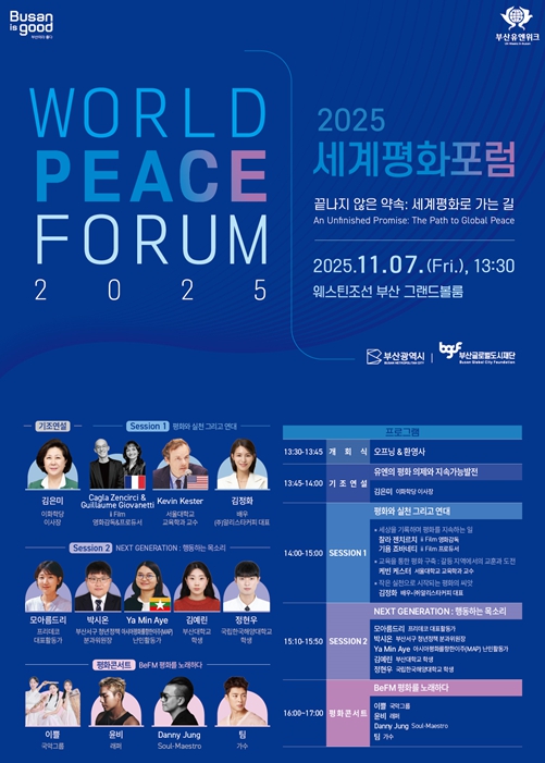 토론자(패널)들은 세대와 문화를 넘어 연대와 공감의 가치를 나누며, 부산이 ‘청년과 시민이 함께 만드는 평화의 도시’로 나아가는 비전을 함께 그려나갈 예정이다.