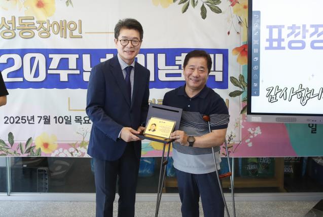 | ▲ 성동장애인자립생활센터 20주년 기념식에서 정원오 성동구청장(사진 왼쪽)에게 조성남 성동장애인자립생활센터장(사진 오른쪽은)이 감사패를 수여하는 모습 |